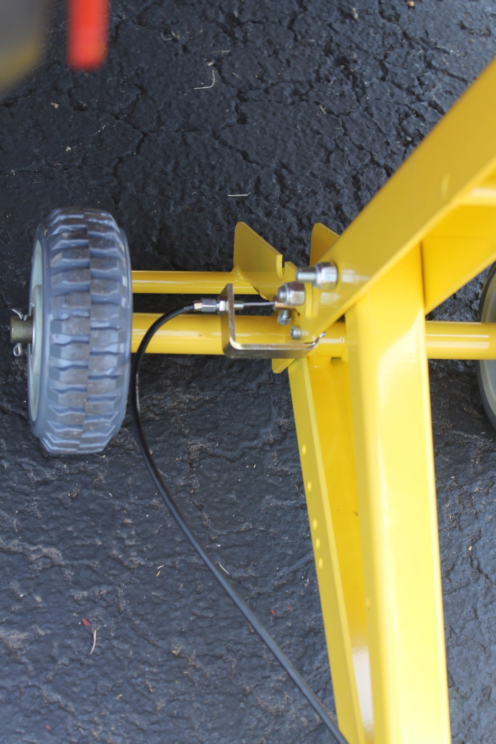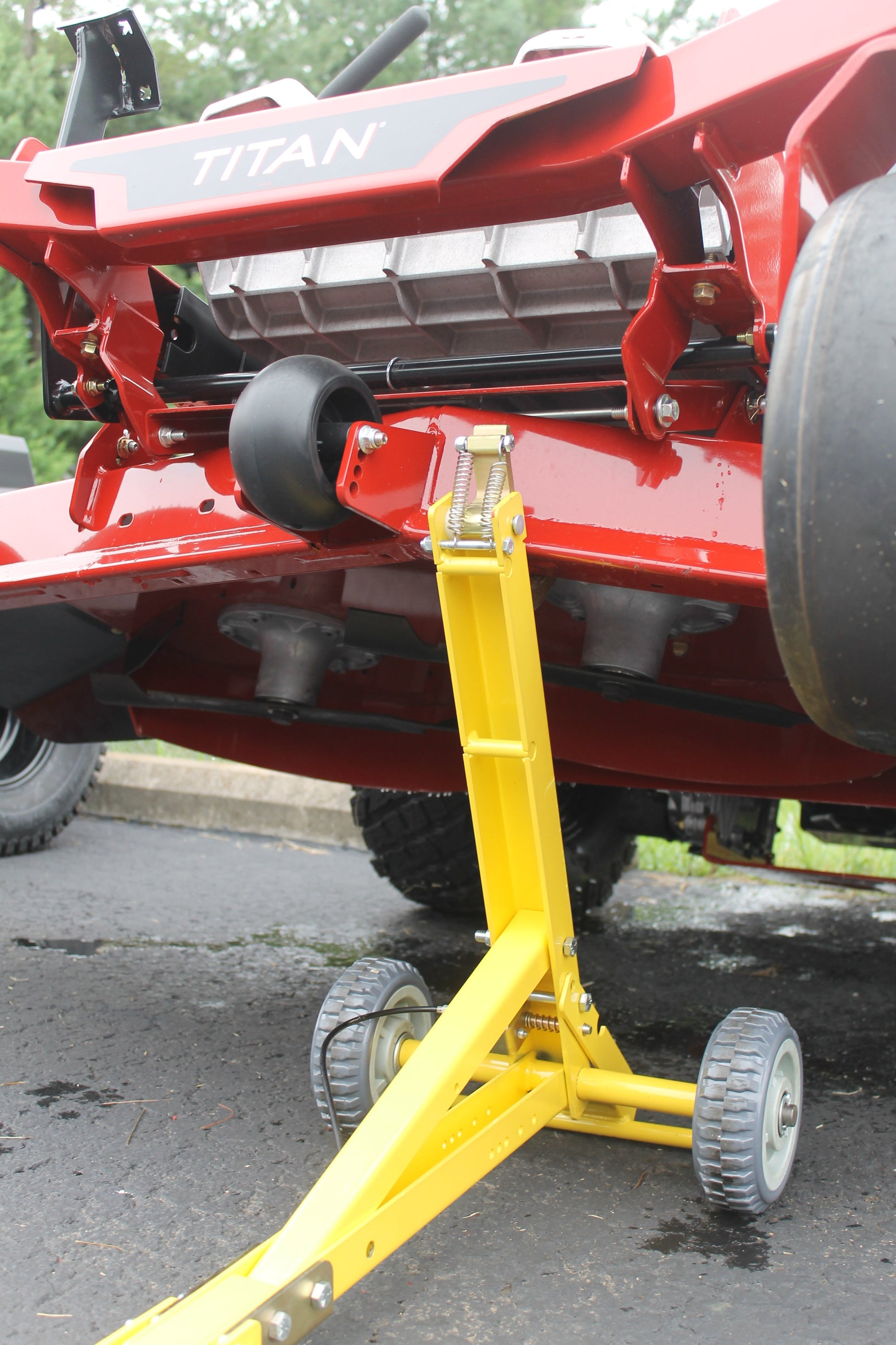 Lift commercial mowers front or rear in 20 seconds!! The Jungle Jack from Jungle Jim’s now gives you the ability to lift virtually any size commercial mower with ease. Both the front or rear of any mower can be picked up by the Jungle Jack to help you perform all your maintenance duties. The Jungle Jack not only has bigger tires, but also a large foot assist for heavier mowers. (Patent #5,678,804)