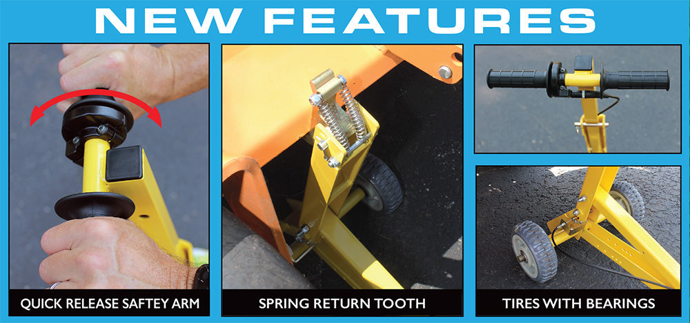 The new and improved single lifting hook on the Jungle Jack makes it easier to lift your equipment approximately 19” off the ground from any angle. It will lift virtually all belt drive and hydro walk-behinds in any size or model. It will also lift any ZTR or stand-on-mower. The Jungle Jack has a lifting capacity of 800 pounds at the lifting point. The large foot assist pedal on the Jungle Jack helps the operator lift the mower with the use of their legs, taking the pressure off the operator’s back and arms. Jungle Jim’s also offers a wider tooth, which enables the user to lift mowers with wider decks.